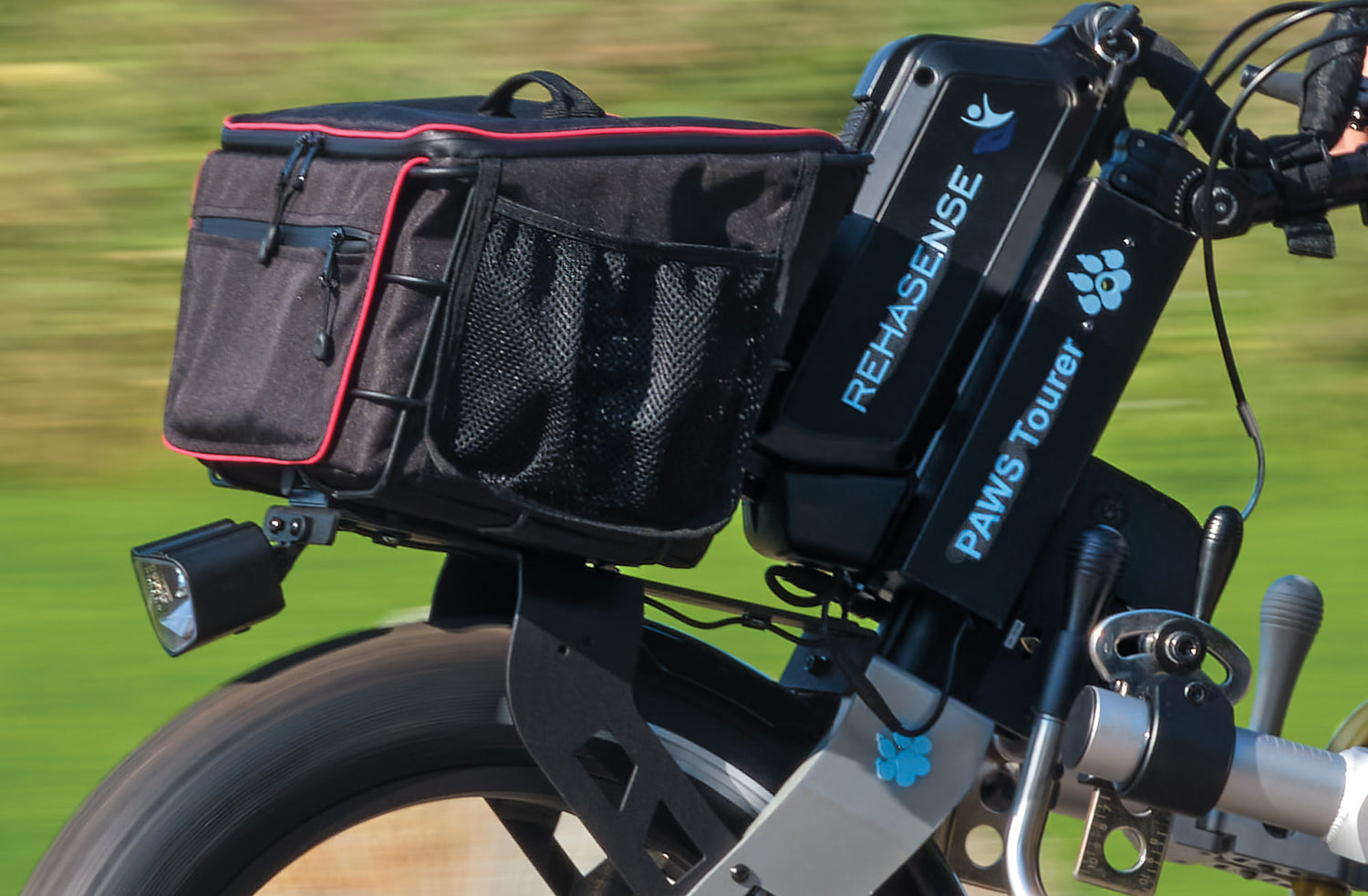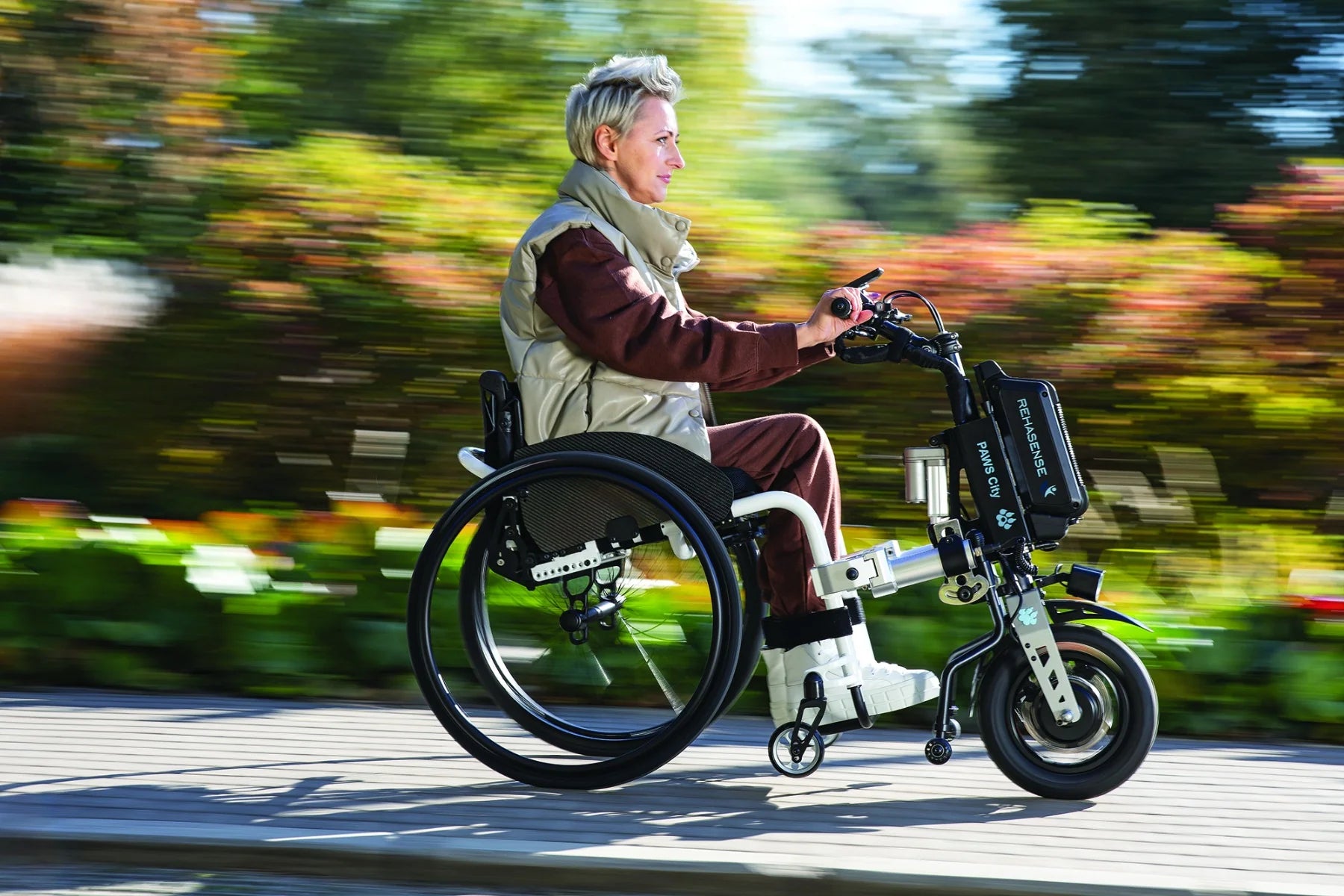The Rehasense PAWS City is a powered bike attachment that clamps onto a manual wheelchair. This transforms the manual wheelchair into a powered trike that enables increased independence.