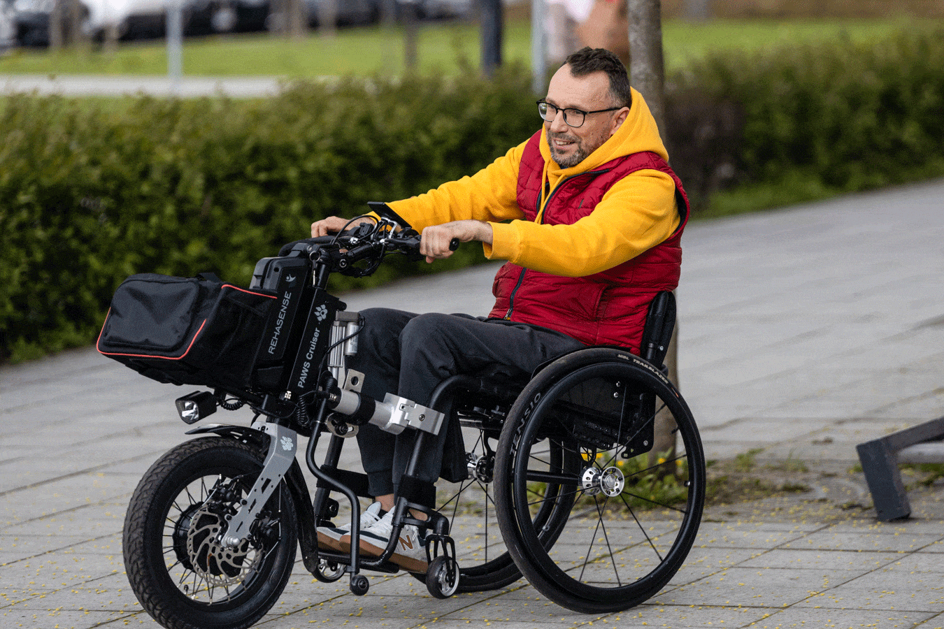 Experience a new level of freedom with the PAWS Cruiser, the ultimate power add-on for your wheelchair. This system transforms your mobility, delivering a powerful ride whether you're on city streets or forest trails. Its 16-inch drive wheel effortlessly absorbs bumps, ensuring a smooth and stable journey on any terrain.